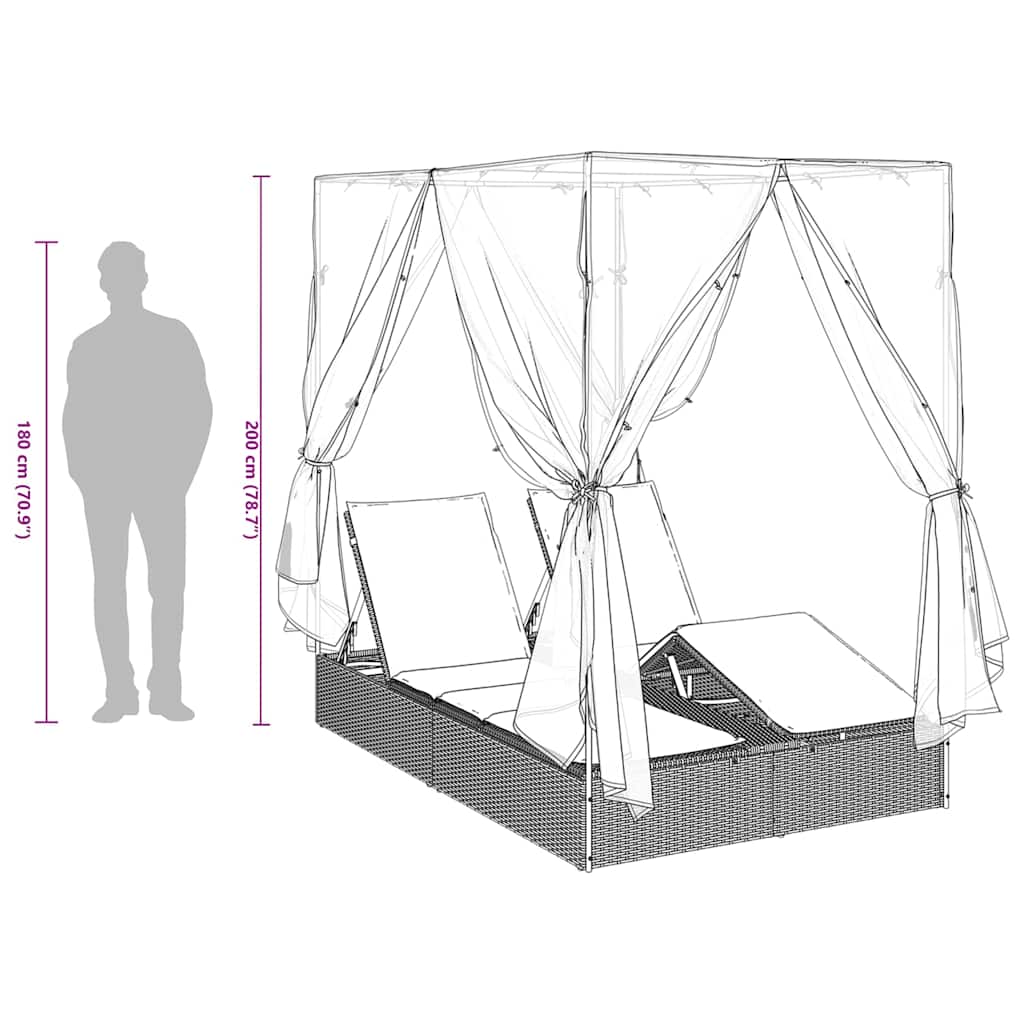 Diese Outdoor Doppel-Sonnenliege vereint Stil und Funktionalität – ideal zum Relaxen im Garten oder auf der Terrasse. Sie hat ein modernes Design, ist aus Poly-Rattan und hat einen stabilen Stahlrahmen, also eine praktische und schicke Wahl für entspannte Stunden im Freien. Die verstellbaren Teile machen sie perfekt für alle, die das Liegen nach ihren Wünschen genießen wollen. Die sanften Linien und der moderne Look bringen frischen Wind in jeden Außenbereich. Das schicke Dach und die passenden Vorhänge schaffen einen persönlichen Rückzugsort. Mit Platz für zwei ist die Liege ideal für Paare oder Gäste. Egal ob du die Sonne genießt oder Schatten suchst, diese Liege hat für jeden etwas zu bieten. Premium Materialien: Diese Liege ist aus wetterfestem Poly-Rattan und einem stabilen Stahlrahmen, der gegen die Elemente gewappnet ist, und sieht dabei echt schick aus. Die Materialien sind langlebig und halten die ästhetischen und funktionalen Vorteile des Produkts über Jahre hinweg frisch. Komponenten: Mit einem Dach und acht Seitenvorhängen ist dieses Set vielseitig und bietet viel Privatsphäre. Zwei Sitzkissen mit abnehmbaren, waschbaren Bezügen sorgen für extra Komfort und ein entspanntes Erlebnis. Elegant designt mit einer verstellbaren Rückenlehne und Fußstütze für individuellen Komfort. Funktionale Eigenschaften: Die verstellbare Rückenlehne und Fußstütze lassen sich personalisieren und machen die Liege perfekt zum Entspannen, Nickerchen oder Lesen – für vollkommene Entspannung. Vielseitige Nutzung: Ideal für diverse Außenbereiche wie Gärten und Terrassen, verwandelt diese Sonnenliege jeden Ort in ein ruhiges Paradies. Sie passt für alles – vom Sonnenbaden bis zu gemütlichen Treffen – und ist eine tolle Ergänzung für dein Outdoor-Setup. Pflege & Wartung: Damit die Liege top bleibt, einfach regelmäßig mit einem trockenen Tuch abwischen. Die Kissen kannst du einfach abnehmen und in die Waschmaschine packen – so bleibt deine Liege immer frisch und sauber.