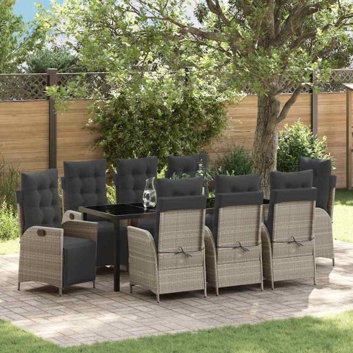 Dieses verstellbare Garten-Dining-Set bringt moderne Schlichtheit und Funktionalität mit cleanen Linien und wenig Schnickschnack. Es ist ideal fürs Essen im Freien in deinem Garten oder auf der Terrasse und bietet Stil und Komfort für deine Sommer-Treffen. Die rechteckige Form und das zeitgemäße Design ergänzen jede Outdoor-Deko und laden zu netten Mahlzeiten und entspannten Gesprächen in der Natur ein. Jedes Detail ist so gestaltet, dass es sich nahtlos in die Umgebung einfügt, während die praktischen, verstellbaren Funktionen dein Erlebnis verbessern. Poly-Rattan und Stahlkonstruktion: Das Dining-Set besteht aus Poly-Rattan und pulverbeschichtetem Stahl, sorgt für Wetterbeständigkeit und ein modernes Aussehen. Der Poly-Rattan sorgt für visuelle Anziehung und stabilisiert das Set. Verstellbarkeit: Mit einem Griff, um die Fußstützen auf verschiedene Höhen einzustellen, kann jeder seinen Platz bequem anpassen. Ideal zum Entspannen im Garten, verleiht diese Funktion dem Set eine vielseitige Note. Einbeziehung von Komponenten: Das Set hat gepolsterte Sitzkissen aus weichem Polyester für zusätzlichen Komfort. Die Tischplatte aus gehärtetem Glas ist pflegeleicht und sieht schick aus. Praktische Verwendung: Perfekt für Terrassen, Gärten und Patios. Ob beim Sommeressen oder einem ruhigen Nachmittagstee, es passt sich jeder Gelegenheit an. Pflege & Wartung: Einfache Pflege, indem du eine Schutzhülle verwendest, wenn es nicht gebraucht wird. So bleibt das Set über längere Zeit in einwandfreiem Zustand und erhöht die Langlebigkeit.