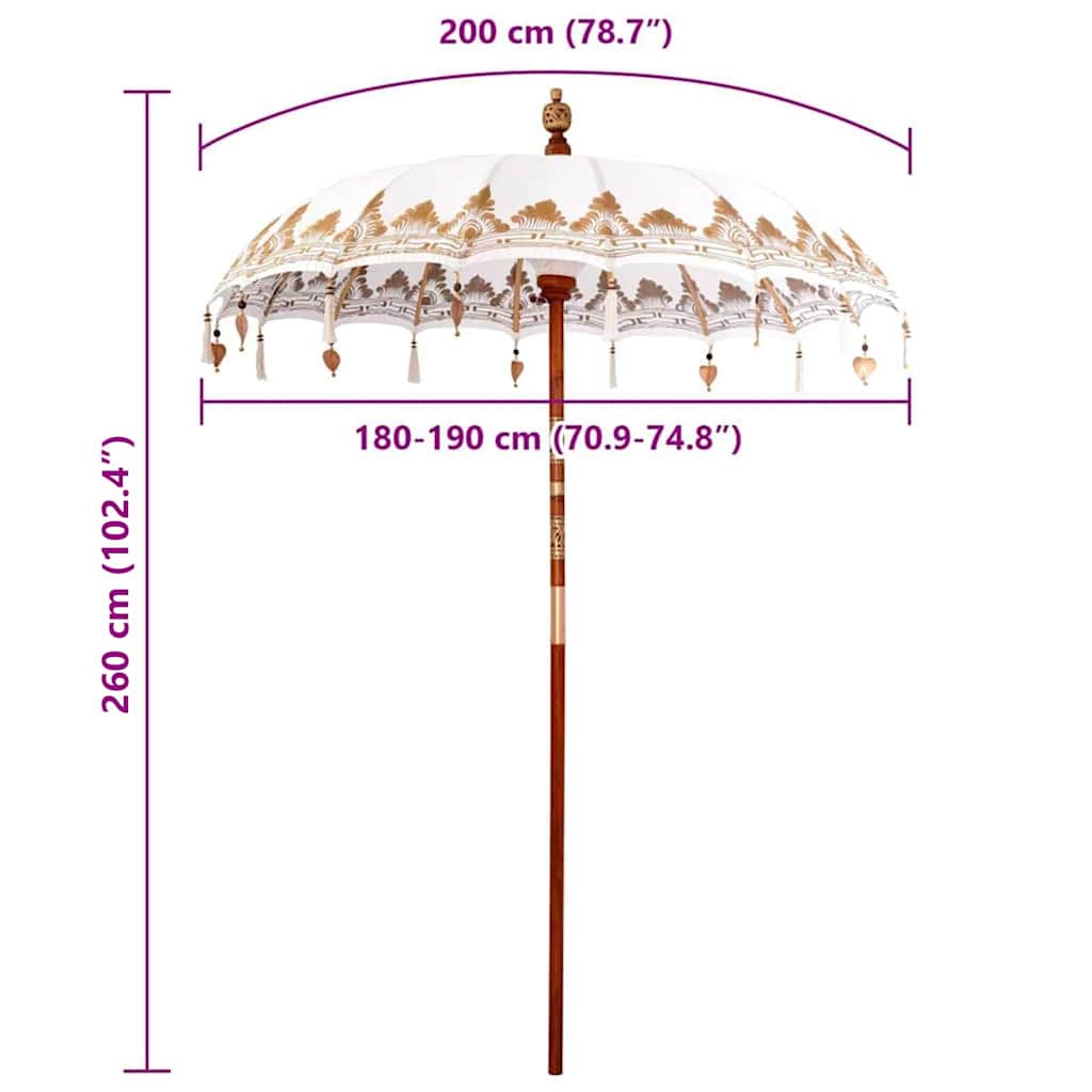 Der balinesische Sonnenschirm ist ein toller Sonnenschirm für draußen, der deinem Garten oder deiner Terrasse exotische Eleganz bringt. Mit seinem wunderschönen, runden Baumwoll-Dach, das handgemachte Details hat, ist er einfach einzigartig. Er ist ideal für Sommerpartys und strahlt entspannte tropische Vibes aus, während er mit seinem großen Durchmesser genug Schatten gibt. Die ruhige Ästhetik sorgt für einen natürlichen, erdigen Charme und eignet sich perfekt für Essen im Freien oder entspannte Momente unter diesem tollen Sonnenschirm. Handgefertigte Eleganz: Jeder Rattanpfosten ist kunstvoll geschnitzt, was dem Sonnenschirm einen einzigartigen Charme verleiht. Die stabile Holzkonstruktion sorgt dafür, dass er ein Blickfang im Außenbereich ist, während die handgefertigten Elemente die Authentizität und den Stil des Sonnenschirms unterstreichen. Tropische Vibes mit Bambusdetails: Die Bambusstreben geben dem Dach seine Form und sind leicht und stabil. Diese Materialwahl bringt die tropische Essenz des Sonnenschirms zum Ausdruck und spiegelt den balinesischen Stil wider, der dafür bekannt ist, die Schönheit der Natur zu umarmen. Vermeide es, das Material schlechten Wetterbedingungen auszusetzen, denn es ist für laue Sommerabende gedacht und gibt dir einen kühlen Rückzugsort. Dekoratives und funktionales Dach: Das Baumwoll-Dach ist blickdicht und bietet tollen Sonnenschutz. Die große Fläche sorgt auch an sonnigen Tagen für Komfort, was ihn ideal für gesellige Runden oder zur entspannten Erholung auf der Terrasse macht. Charmante Akzente: Mit Glocken und Quasten hat der Sonnenschirm einen spielerischen Touch, der bei jedem Windstoß in Bewegung kommt. Diese Elemente fügen deiner Außenfläche Struktur und Attraktivität hinzu, was Bewunderung weckt und ein tolles Erlebnis schafft. Pflege und Langlebigkeit: Schütze den Sonnenschirm bei schlechtem Wetter, indem du ihn abdeckst oder verstaut. Regelmäßige sanfte Reinigung sorgt dafür, dass er lange so aussieht wie neu, damit er ein beliebtes Outdoor-Element bleibt. Bei Bedarf kannst du ihn ganz einfach mit einem Schraubendreher versetzen und sicherstellen, dass er dir über die Jahre hinweg Freude bereitet.