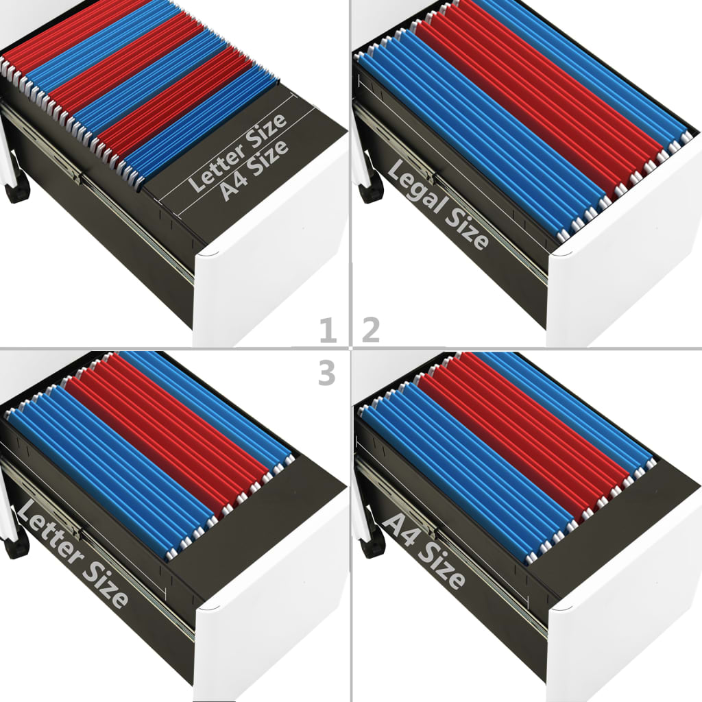 Mit seinem modernen Design eignet sich dieser Aktenschrank mit Rollen ideal für die Aufbewahrung Ihrer Unterlagen. Aus Stahl gefertigt, ist dieser Büroschrank nicht nur langlebig, sondern lässt sich auch einfach reinigen. Mit 3 Schubladen und 1 Schloss versehen, lassen sich in diesem Aktenschrank all Ihre Unterlagen ordentlich in verschiedene Kategorien einsortieren und sicher aufbewahren. Jede Schublade ist mit einer abnehmbaren Hängestange ausgestattet, die sich frei kombinieren lässt, um Aktenorder in Letter-, Legal- oder A4-Format aufzubewahren. Dieser Rollschrank ist auch mit einem Schreibmaterial-Auszug versehen, um für Ordnung auf Ihrem Schreibtisch zu sorgen. Die 3-fach kugelgelagerten Schubladen lassen sich sanft öffnen und schließen und selbst unter erhöhter Belastung vollständig ausziehen. Zudem sind die linken und rechten Ecken des Schranks abgerundet. Dieser Aktenschrank findet problemlos Platz unter dem Schreibtisch und passt mit seinem ikonischen Design zu jeder Büroeinrichtung.