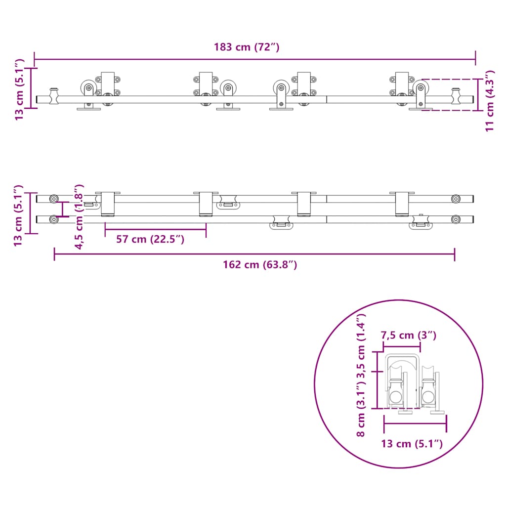 Mit diesem Schiebetür-Beschlagsatz kannst du ganz einfach zwei Schienen für ein Paar Türen einrichten, die vor und hintereinander gleiten. Sicher und zuverlässig: Dank der innenliegenden Kugellager gleiten deine Türen sanft und leise. Außerdem sind Türstopper enthalten, die ein Entgleisen der Rollen verhindern, während die Gummidichtungen die Stöße der Rollen abfedern und die Geräusche reduzieren.Strapazierfähiges Material: Edelstahl zeichnet sich durch seine Festigkeit und außergewöhnliche Widerstandsfähigkeit gegen Verformung und Rost aus und gewährleistet so Haltbarkeit und Langlebigkeit.Ideal für doppelte Scheunentore: Wenn der Platz an der Wand begrenzt ist, können mit dem Scheunentor-Bypass-Halterungssatz zwei Scheunentore unabhängig voneinander auf zwei Schienen gleiten, ohne dass zusätzlicher Abstand erforderlich ist.Einfache Installation: Das Schiebetürbeschlag-Set lässt sich mit dem mitgelieferten Montagezubehör leicht am Scheunentor anbringen, sodass die Installation ein Kinderspiel ist.Breite Anwendung: Mit diesem Halterungsset für Scheunentore kann eine Tür über eine andere geschoben werden, was es perfekt für Schränke, Vorratskammern oder möglicherweise sogar mehrere Öffnungen an derselben Wand macht. Gut zu wissen:Die Lieferung umfasst nur den Schiebetürbeschlagsatz. Die Tür ist nicht in der Lieferung enthalten.