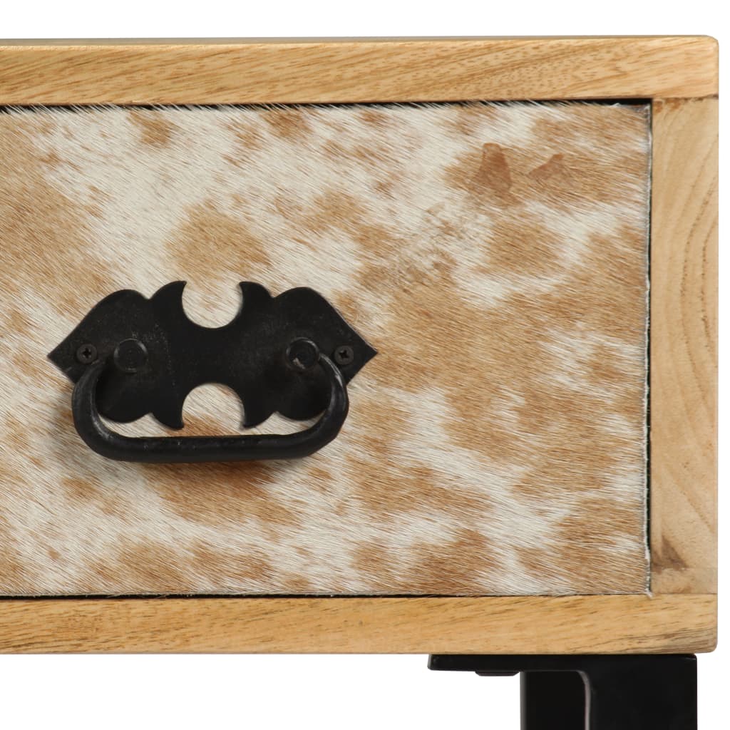 Dieser Schreibtisch aus massivem Mangoholz strahlt einen rustikalen Charme aus und wird Ihr Zuhause oder Büro komfortabler machen. Es kann auch als Konsolentisch oder Computertisch genutzt werden. Der Schreibtisch besteht aus Mangoholz, das solide, stabil, langlebig und schön ist. Die Handwerkskunst trägt zu seinem spektakulären Retro-Stil bei. Jeder Schritt des Herstellungsprozesses wird mit größter Sorgfalt durchgeführt, sei es beim Polieren, Anstreichen oder Lackieren. Die handwerkliche Verarbeitung und die schönen Holzmaserungen machen jedes Möbelstück einzigartig und unverwechselbar. Der Konsolentisch verfügt über vier Schubladen, von denen jede über eine einzigartige Funktion verfügt. Die exquisiten bemalten Details, der dekorative Akzent aus Echtleder sowie die Griffe und Stahlbeine im Industriestil sind in diesem Möbelstück auf raffinierte Weise kombiniert. Die Schubladen bieten ausreichend Platz, um Ihre Akten und andere Büromaterialien übersichtlich zu halten. Die Montage ist einfach. Wichtiger Hinweis: Holzmaserung, Farbe und Ledermuster variieren von Stück zu Stück und machen jeden unserer Tische einzigartig. Die Lieferung erfolgt nach dem Zufallsprinzip.