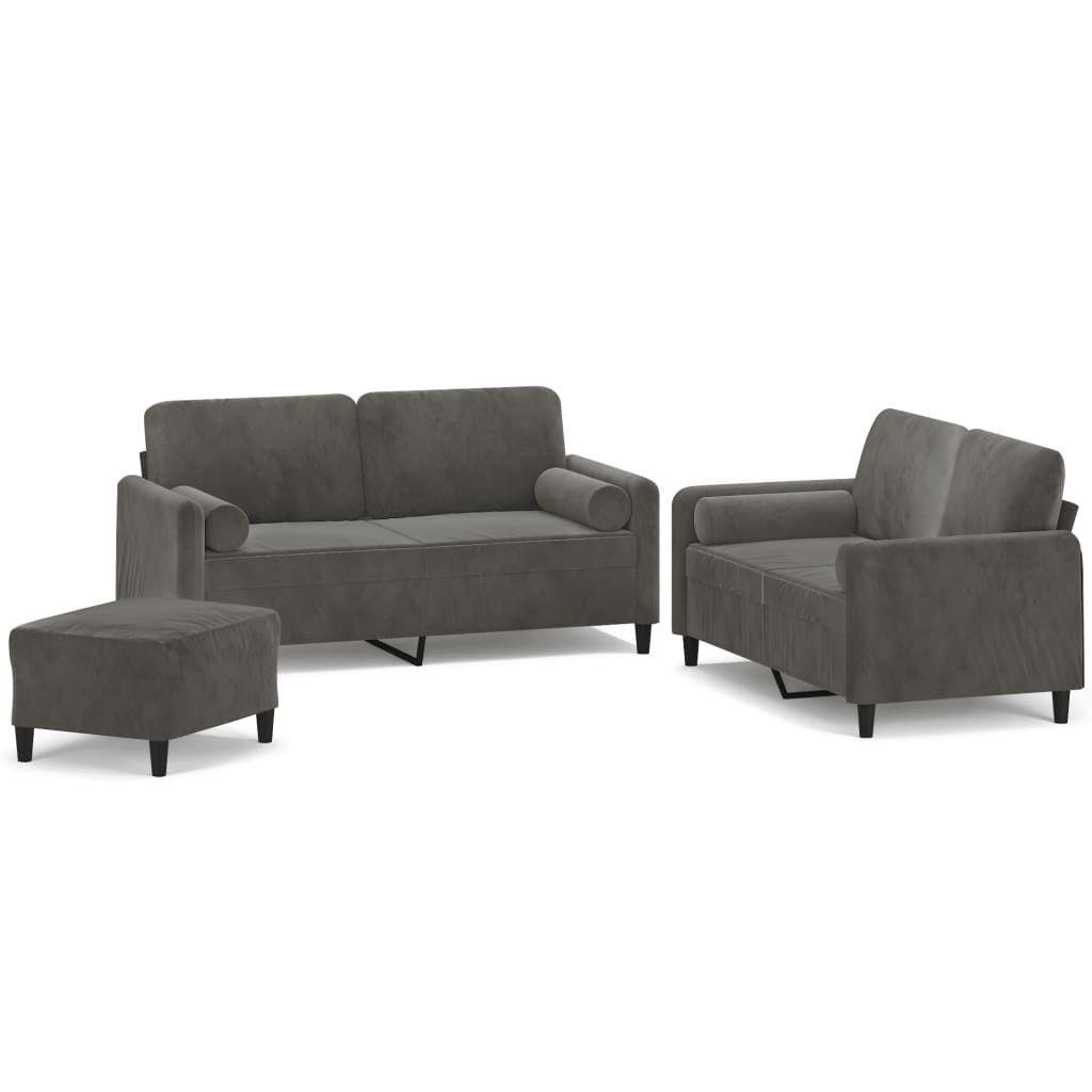 Diese Sofagarnitur bietet einen ausgezeichneten Platz zum Plaudern, Lesen, Fernsehen oder einfach nur zum Entspannen. Sie wird ein echter Blickfang in deinem Zuhause sein. Weicher Samt: Samt ist ein weicher, luxuriöser Stoff, der sich durch seinen dichten Flor aus gleichmäßig geschnittenen Fasern auszeichnet, die einen glatten Flor haben. Samt fühlt sich unverwechselbar weich an und ist angenehm zu berühren.Robuster und stabiler Rahmen: Der Rahmen aus Sperrholz und Metall verleiht dem Samtsofa Robustheit und Stabilität.Bequemes Sitzerlebnis: Mit dick gepolsterten Sitzflächen, Armlehnen und Rückenkissen versehen, ist das Sofa sehr bequem.Praktische Rollkissen: Diese Zylinderkissen werten nicht nur deine Einrichtung auf, sondern sorgen auch für zusätzlichen Komfort beim Sitzen oder Liegen.Vielseitiger Fußhocker: Der Hocker bietet Platz zum Ausruhen der Füße beim Liegen auf dem Sofa, kann aber auch als zusätzliche Sitzgelegenheit in deinem Zimmer dienen. Darüber hinaus eignet er sich durch sein schlichtes Design und seine kompakte Größe für fast alle Wohnräume. Hinweis:Jedes Produkt wird mit einer Montageanleitung in der Verpackung für eine einfache Montage geliefert.