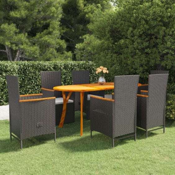 Schaffen Sie mit dieser Garten-Essgruppe eine überzeugende und zusammenhängende Ästhetik in Ihrem Außenbereich! Dieser Gartentisch ist aus massivem Akazienholz gefertigt, was ihn robust und stabil macht. Durch die geölte Oberfläche lässt sich der Tisch zudem leicht mit einem feuchten Tuch reinigen. Darüber hinaus tragen die geschwungenen Beine zu seinem stilvollen Design bei. Mit einem Stahlrahmen, der mit wetterbeständigem PE-Rattan geflochten ist, sind diese Essstühle robust und leicht zu reinigen. Die dick gepolsterten Kissen sorgen für zusätzlichen Komfort beim Entspannen. Die Rückenlehne und das Fußteil werden durch Betätigen des seitlichen Knopfes verstellt. Hinweis: Um die Lebensdauer Ihrer Gartenmöbel zu verlängern, empfehlen wir Ihnen, diese regelmäßig zu reinigen und bei Nichtgebrauch im Freien abzudecken.Reinigung: Verwenden Sie eine milde SeifenlösungLagerung: Wenn möglich, an einem kühlen, trockenen Ort im Innenbereich lagern. Wenn das Produkt im Freien gelagert wird, schützen Sie es mit einer wasserdichten Abdeckung. Wischen und trocknen Sie das überschüssige Wasser oder den Schnee nach Regen oder Schneefall von der ebenen Fläche. Sorgen Sie für eine ausreichende Luftzirkulation, um feuchtigkeitsbedingte Schäden zu vermeiden.