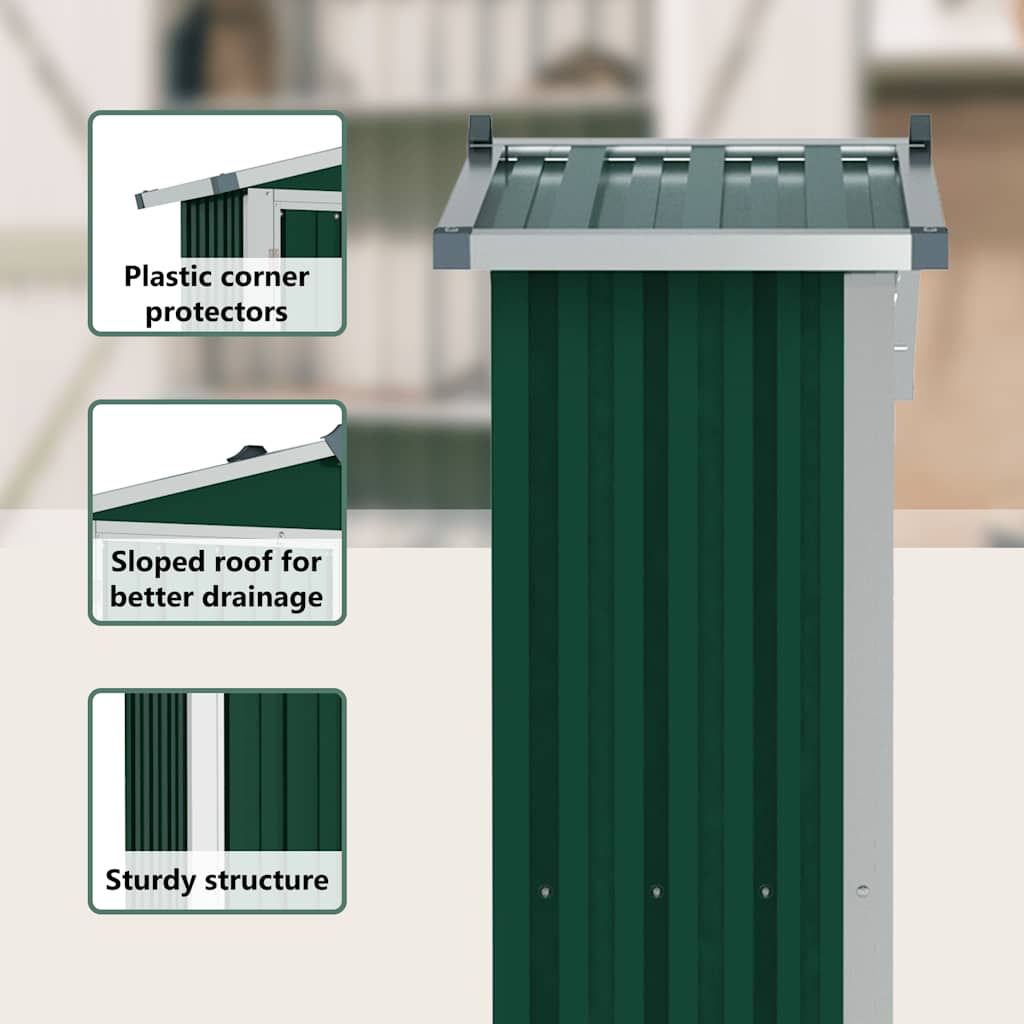Dieses Gartenhaus eignet sich ideal zur Aufbewahrung verschiedenster Gegenstände wie Werkzeuge, Gartenmöbel, Gartengeräte usw. Es bietet Schutz vor Schmutz, Staub, starkem Wind und rauem Wetter. Dieses Lagerhaus ist mit Lüftungsschlitzen ausgestattet, die für eine optimale Belüftung sorgen und so die Ansammlung von Feuchtigkeit und Gerüchen im Haus reduzieren. Dank der Regale bietet es ausreichend Stauraum für Ihre wichtigsten Gegenstände. Dank der verzinkten Stahlkonstruktion ist dieses Gartenhaus äußerst wartungsarm und langlebig. Die Doppeltüren an der Vorderseite ermöglichen ein einfaches Ein- und Aussteigen. Dank des schrägen Dachs läuft Regenwasser automatisch ab. Gut zu wissen:Um Schäden durch starken Schnee zu vermeiden, empfehlen wir, das Dach im Winter regelmäßig zu räumen.