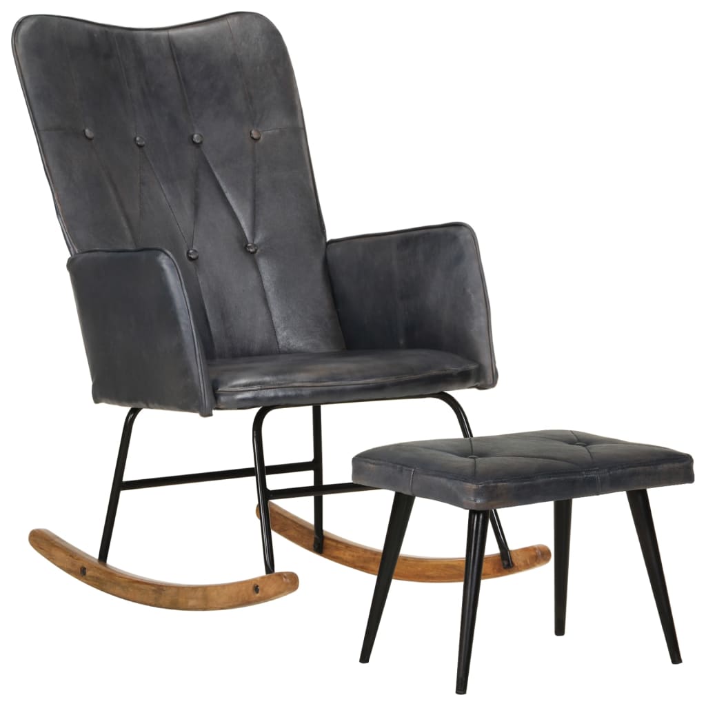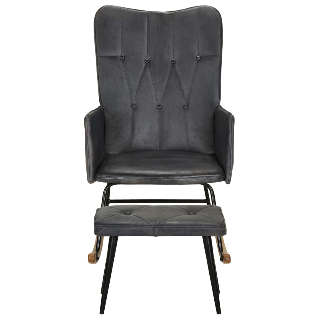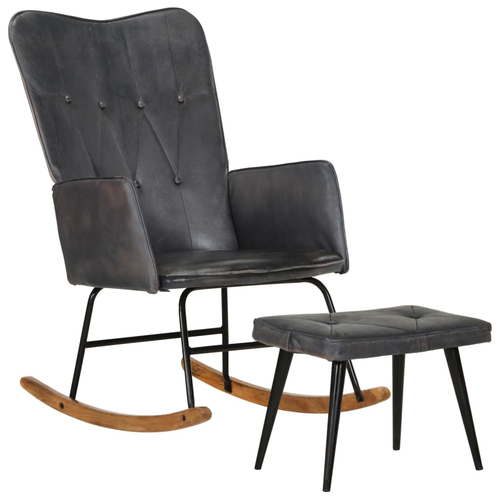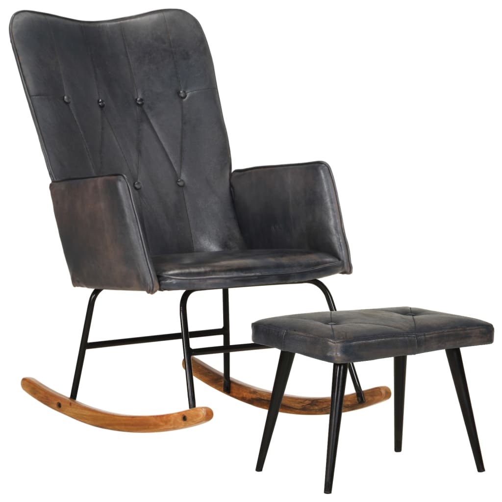 Auf diesem gepolsterten Schaukelstuhl mit Hocker kannst du dich in deinem Wohn-, Schlafzimmer oder Lounge entspannen und den Alltag hinter dir lassen! Luxuriöses Material: Echtleder ist ein zeitloses Naturmaterial. Es kann bei ordnungsgemäßer Pflege und Wartung ein Leben lang halten. Die glatte Oberfläche verleiht ihm einen luxuriösen Look und sorgt gleichzeitig für optimalen Komfort.Schaukelfunktion: Entspanne dich, während du eine bequeme Sitzposition und die beruhigende, sanfte Schaukelbewegung genießt. Dieser Relaxstuhl ist eine perfekte Ergänzung zu jedem Schlaf- und Wohnzimmer und hinterlässt einen bleibenden Eindruck!Optimale Sitzgelegenheit: Der dick gepolsterte Sitz und die weiche Rückenlehne sorgen für zusätzlichen Sitzkomfort.Stabile Füße: Die Eisenfüße verleihen diesem Stuhl zusätzliche Stabilität.Zusätzlicher Komfort: Auf den Armlehnen können Sie Ihre Arme bequem ausruhen. Die mitgelieferte Fußstütze eignet sich perfekt zum Entspannen und Hochlegen der Füße. Hinweis:Jedes Produkt wird mit einer Montageanleitung in der Verpackung für einen einfachen Zusammenbau geliefert.Die Farben können von Artikel zu Artikel variieren, wodurch jedes Möbelstück einzigartig ist. Die Lieferung erfolgt nach dem Zufallsprinzip, wodurch die Exklusivität und Individualität deines Produkts gewährleistet wird.