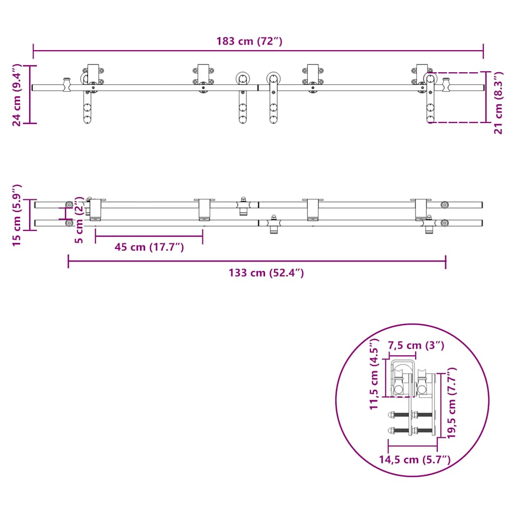 Mit diesem Schiebetür-Beschlagsatz kannst du ganz einfach zwei Schienen für ein Paar Türen einrichten, die vor und hintereinander gleiten. Sicher und zuverlässig: Dank der innenliegenden Kugellager gleiten deine Türen sanft und leise. Außerdem sind Türstopper enthalten, die ein Entgleisen der Rollen verhindern, während die Gummidichtungen die Stöße der Rollen abfedern und die Geräusche reduzieren.Strapazierfähiges Material: Edelstahl zeichnet sich durch seine Festigkeit und außergewöhnliche Widerstandsfähigkeit gegen Verformung und Rost aus und gewährleistet so Haltbarkeit und Langlebigkeit.Ideal für doppelte Scheunentore: Wenn der Platz an der Wand begrenzt ist, können mit dem Scheunentor-Bypass-Halterungssatz zwei Scheunentore unabhängig voneinander auf zwei Schienen gleiten, ohne dass zusätzlicher Abstand erforderlich ist.Einfache Installation: Das Schiebetürbeschlag-Set lässt sich mit dem mitgelieferten Montagezubehör leicht am Scheunentor anbringen, sodass die Installation ein Kinderspiel ist.Breite Anwendung: Mit diesem Halterungsset für Scheunentore kann eine Tür über eine andere geschoben werden, was es perfekt für Schränke, Vorratskammern oder möglicherweise sogar mehrere Öffnungen an derselben Wand macht. Gut zu wissen:Die Lieferung umfasst nur den Schiebetürbeschlagsatz. Die Tür ist nicht in der Lieferung enthalten.