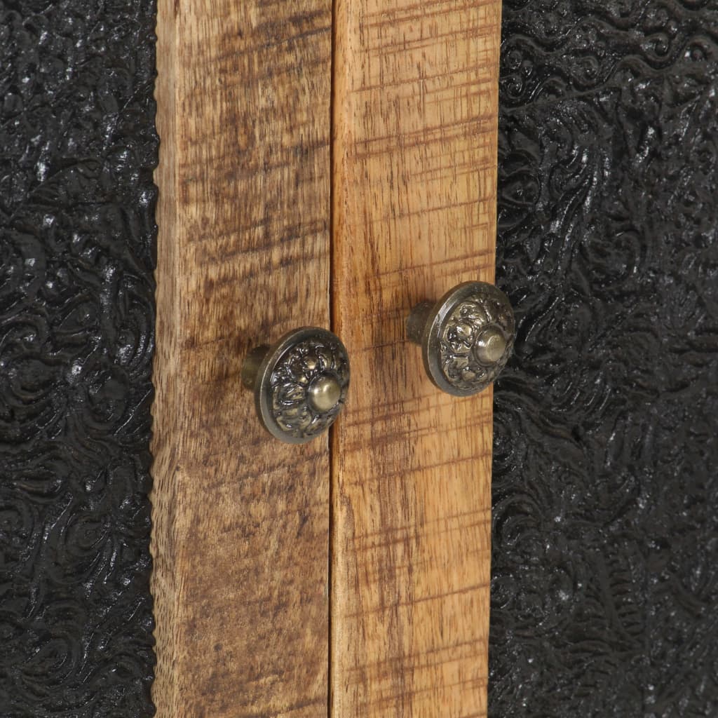 Dieses Sideboard aus Holz verleiht deinem Wohnzimmer einen industriellen Stil. Der Beistellschrank ist aus rauem Mangoholz gefertigt, einem tropischen Hartholz, das belastbar und verschleißfest ist. Es verleiht dem Möbelstück Stabilität und Langlebigkeit. Der pulverbeschichtete Eisenrahmen sorgt für zusätzliche Standfestigkeit. Dieser Schrank verfügt über zwei Türen mit handgeschnitztem Muster und bietet reichlich Stauraum. Darüber hinaus eignet sich die robuste Deckplatte ideal zum Platzieren von Dekoartikeln wie Fotorahmen, Topfpflanzen, Vasen usw. Wichtiger Hinweis: Farbe und Maserung können von Stück zu Stück variieren, was jedes Möbelstück einzigartig macht. Die Lieferung erfolgt nach dem Zufallsprinzip, was die Exklusivität und Individualität deines Produkts gewährleistet.
