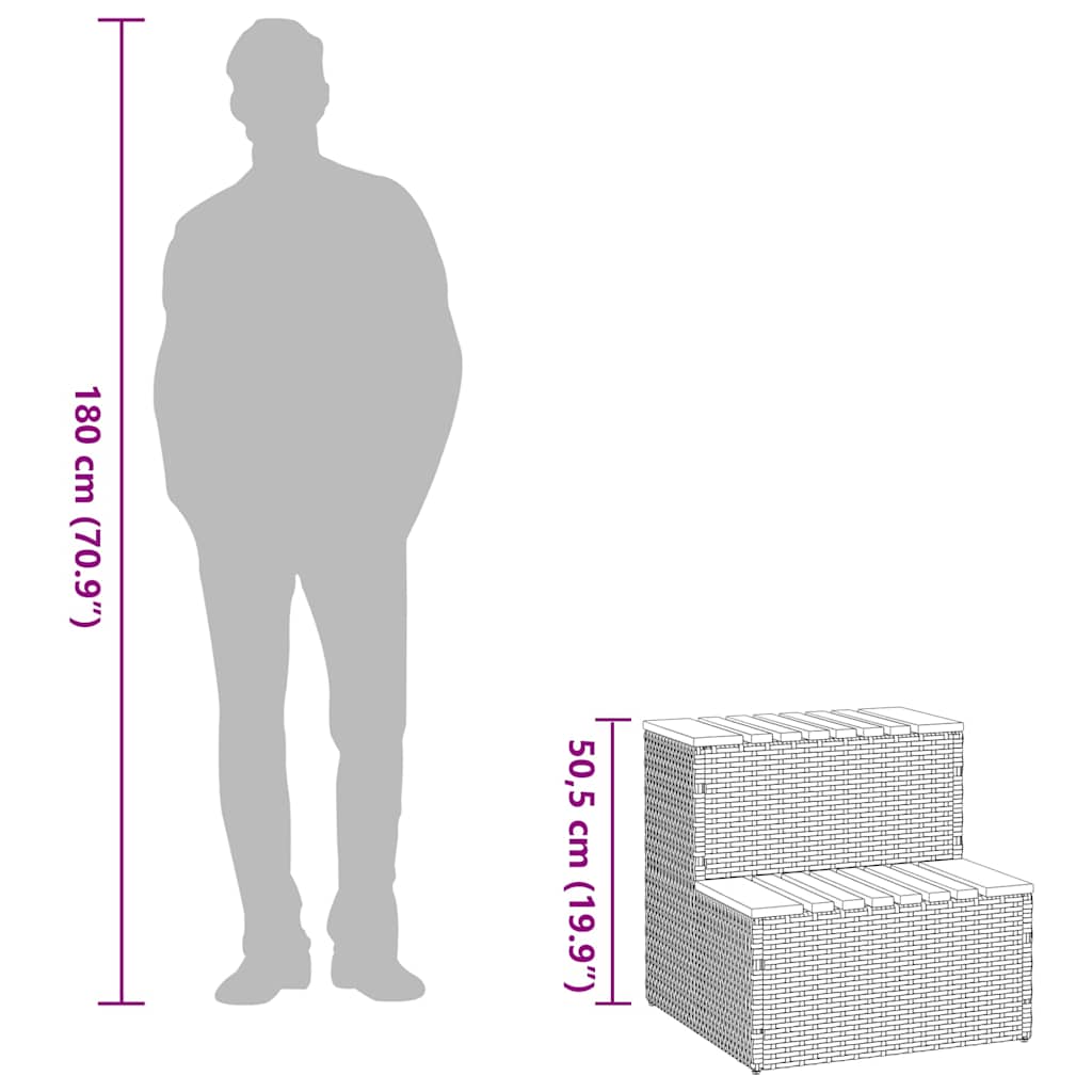 Genießen Sie einen sicheren und einfachen Ein- und Ausstieg aus Ihrem Whirlpool mit dieser heißen Tup-Stufe. Langlebiges Material: PE-Rattan, auch als Poly Rattan bekannt, ist ein robustes, pflegeleichtes synthetisches Material, das die Optik von natürlichem Rattan aufweist. Es kennzeichnet sich durch ein geringes Eigengewicht und lässt sich einfach reinigen. Aufgrund seiner Haltbarkeit und Witterungsbeständigkeit wird es häufig bei der Herstellung von Gartenmöbeln verwendet.Erhöhte Sicherheit: Die Spa-Treppe verfügt über horizontale Holzschlitze, die einen effektiven Wasserabfluss und eine erhöhte Reibung gewährleisten und auch bei Nässe einen stabilen und sicheren Stand bieten, sodass Sie sicher in Ihren Whirlpool ein- und aussteigen können.Verstellbare Füße: Der 2-stufige Hocker ist mit verstellbaren Nivellierfüßen ausgestattet, mit denen du die Höhe individuell anpassen kannst und die Stabilität auf unebenen Böden gewährleisten.Robustes und stabiles Gestell: Der pulverbeschichtete Stahlgestell ist stark, stabil, langlebig sowie korrosions- und wetterbeständig, um eine lang anhaltende Leistung zu gewährleisten.Vielseitige Verwendung: Diese Stufen sind auf Flexibilität ausgelegt und eignen sich nicht nur perfekt für runde oder quadratische Whirlpools und Pools, sondern auch für den Einsatz auf Terrassen, Wohnmobilen und an jedem anderen Ort, an dem robuste, zuverlässige Stufen benötigt werden. Gut zu wissen:Wir empfehlen dir, deine Gartenmöbel mit einer wasserdichten Hülle zu schützen, um lange Zeit eine ansprechende Optik aufzuweisen.